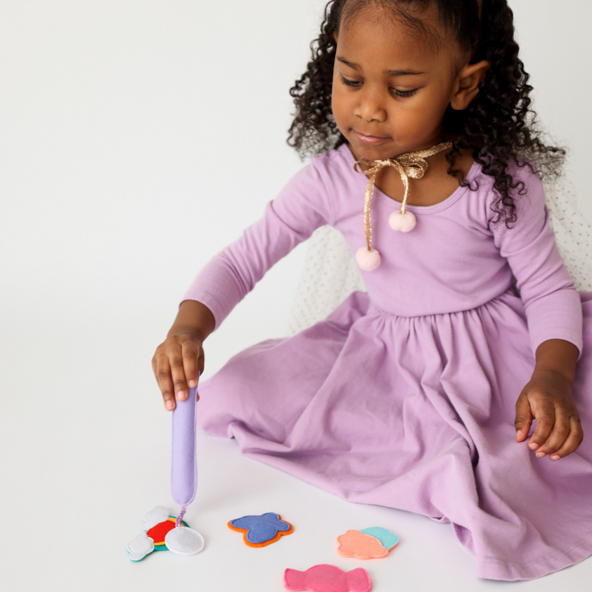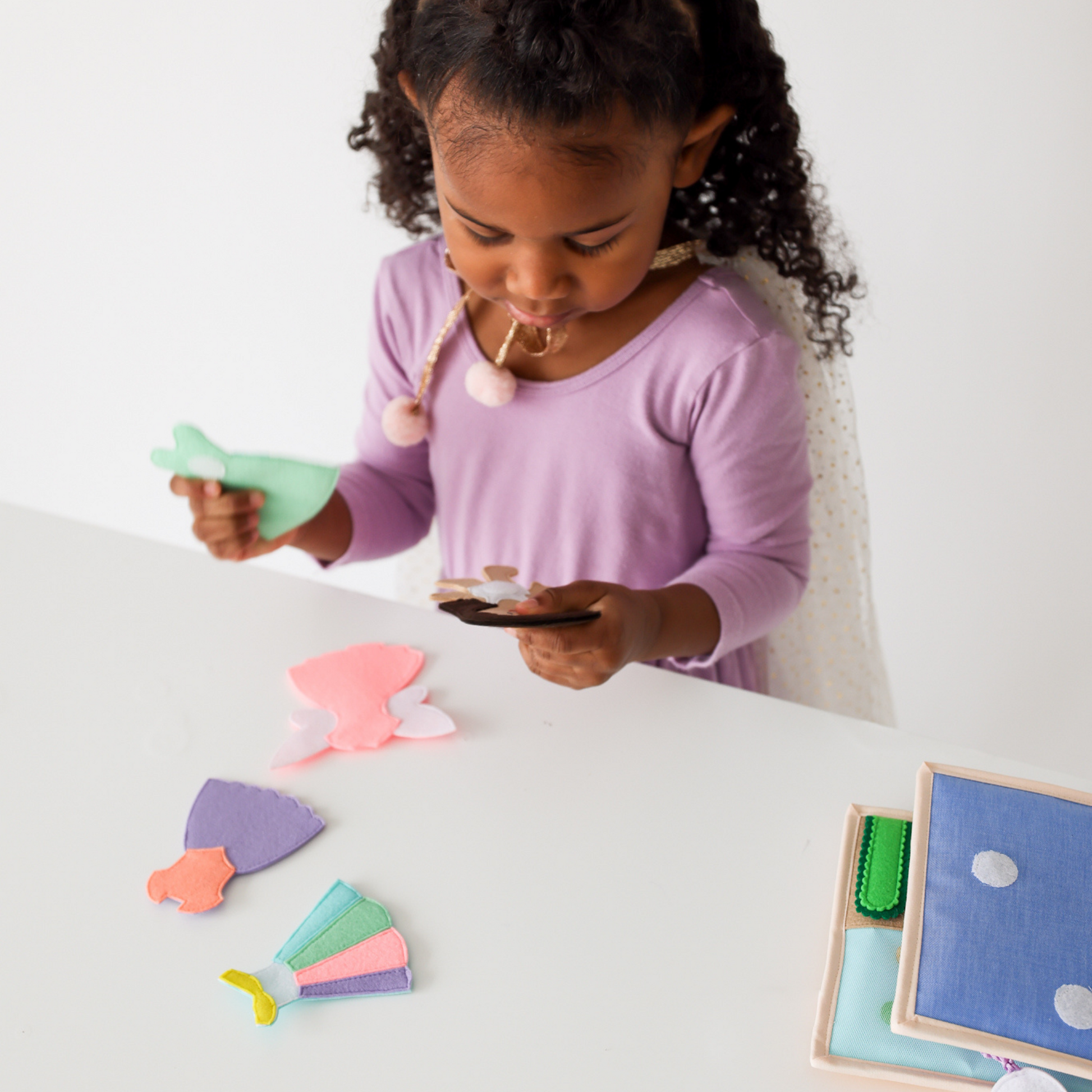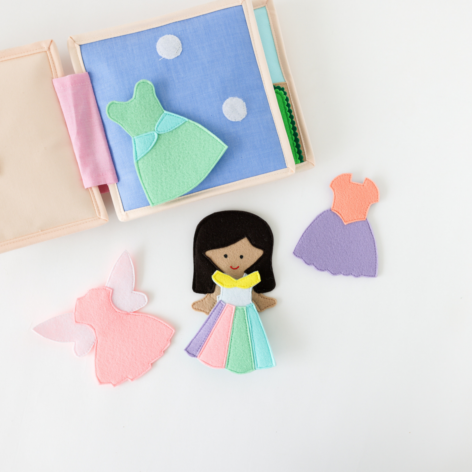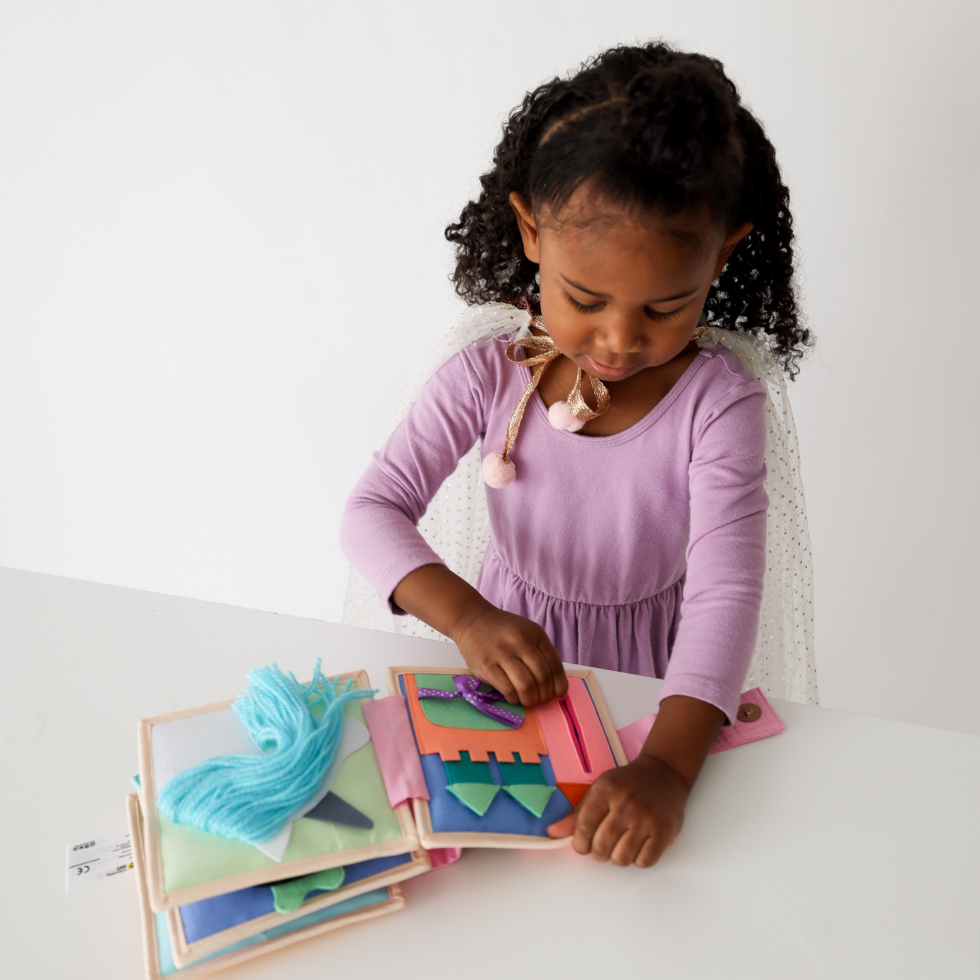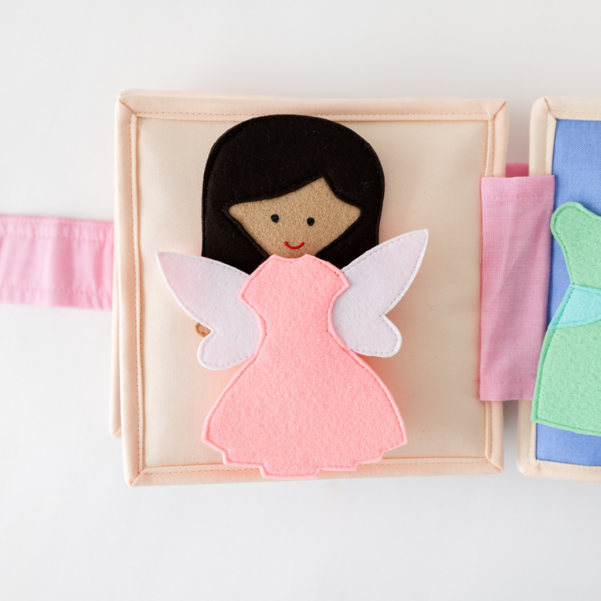 Watch your child step into a fairytale! Designed with practical skills in mind, it offers lacing, buttoning (on an elasticated cord), zipping, snaps, and Velcro activities. Immerse yourself in the magic of a castle filled with practical skill challenges. Style the gorgeous unicorn's braidable hair, perfect for enhancing bilateral coordination. Discover the little fairy with four delightful outfits, a dresser featuring a magnetic fishing game, a mirror, and a button maze for color matching, counting, and basic math. If you desire a different doll, simply let us know in the seller notes and we'll happily make the change. Dive into the world of fairytales and hands-on learning with our Little Fairy mini-book!