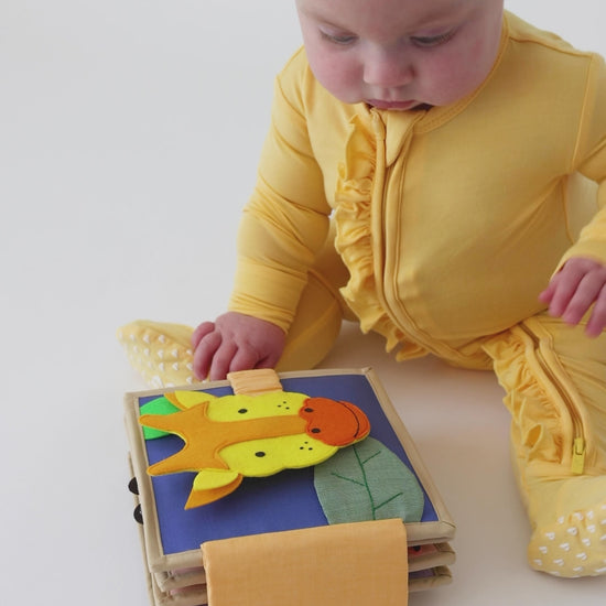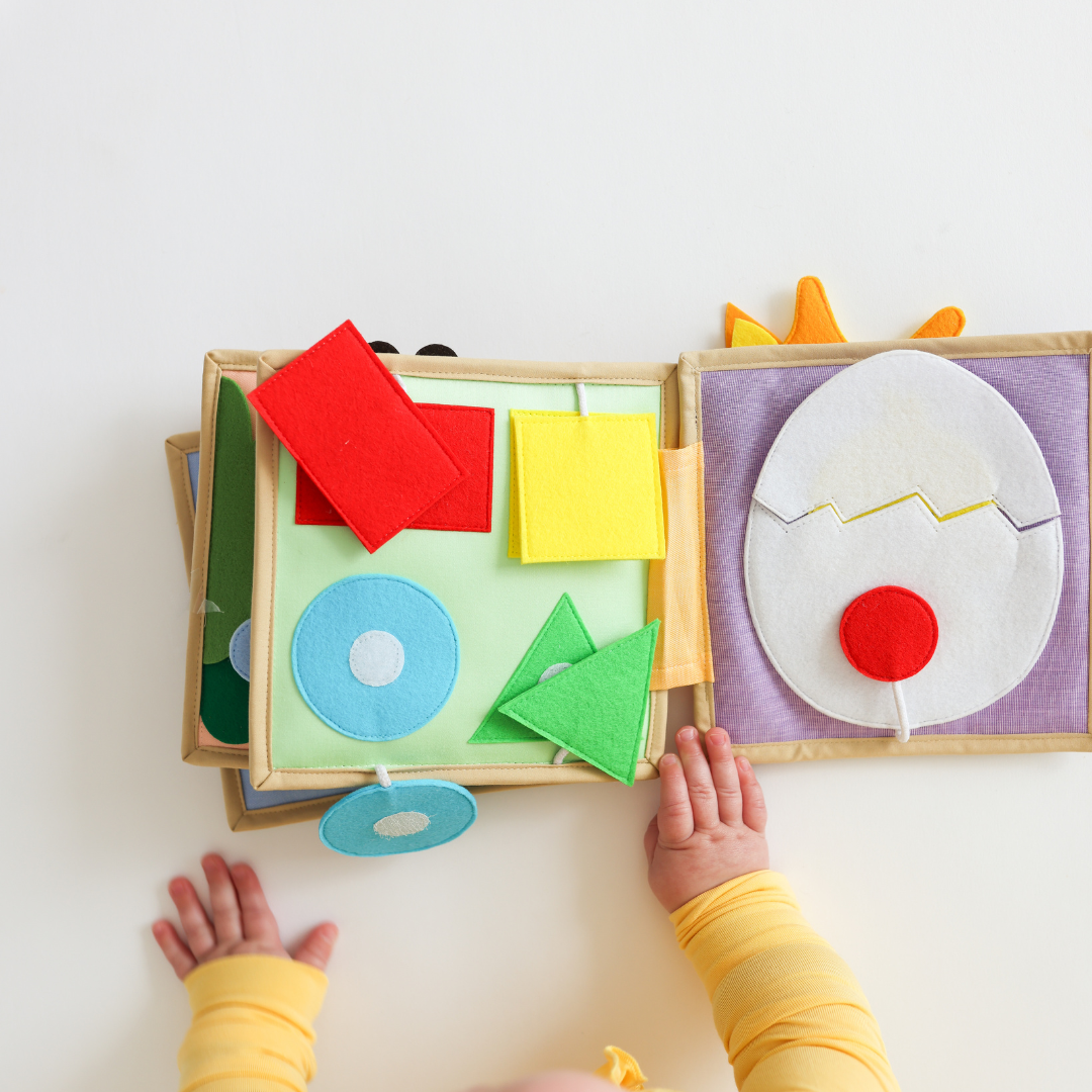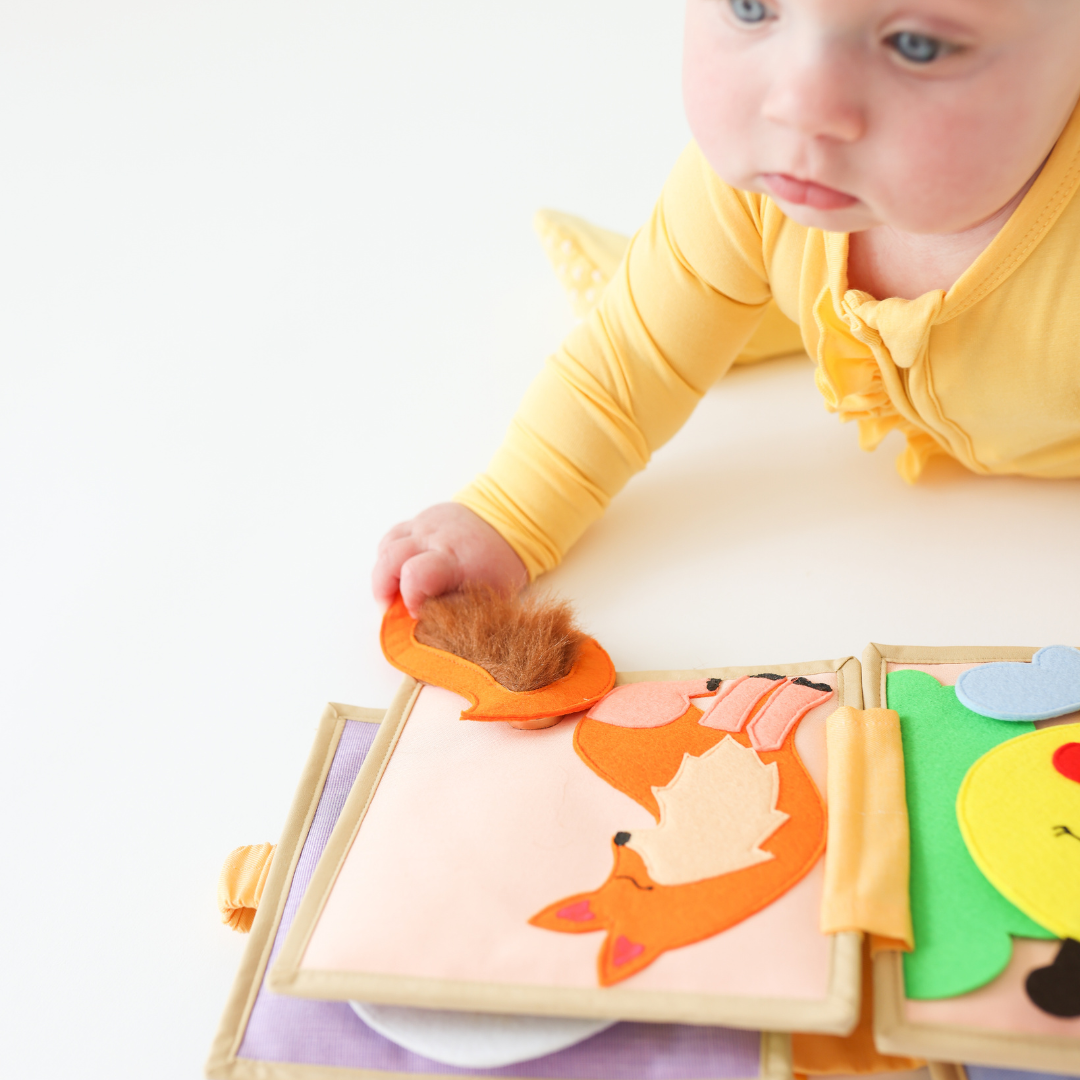 This quiet book is packed with adventures for a 6-18 months baby and comes with a number of features including: Tummy time mirrors, nested play, peekaboo, textured, fabrics, shape/color recognition, Puppets, and more!