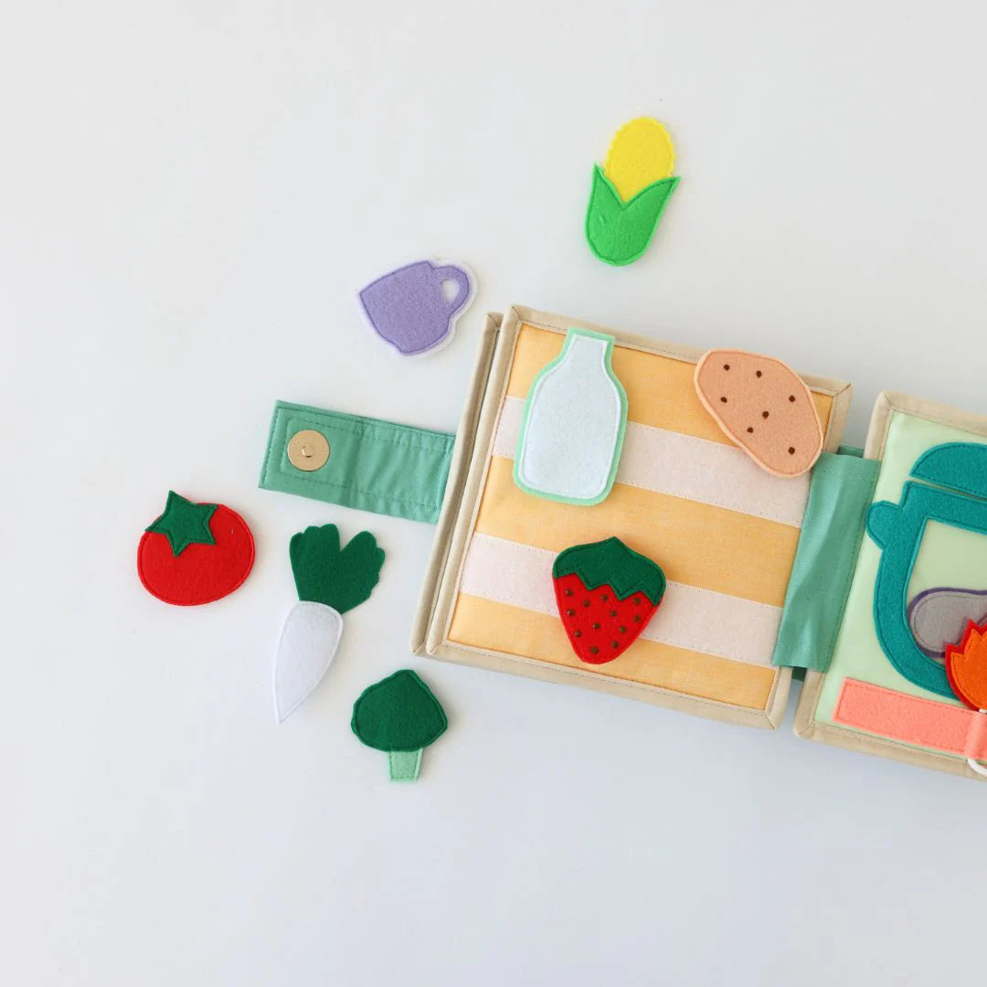 The playbook features three adorable finger puppets in unique colors, along with a buckle and an enchanting animal train. The back page showcases a stove top complete with a selection of vegetables, fruits, and a teacup, providing endless opportunities for storytelling and creative play.