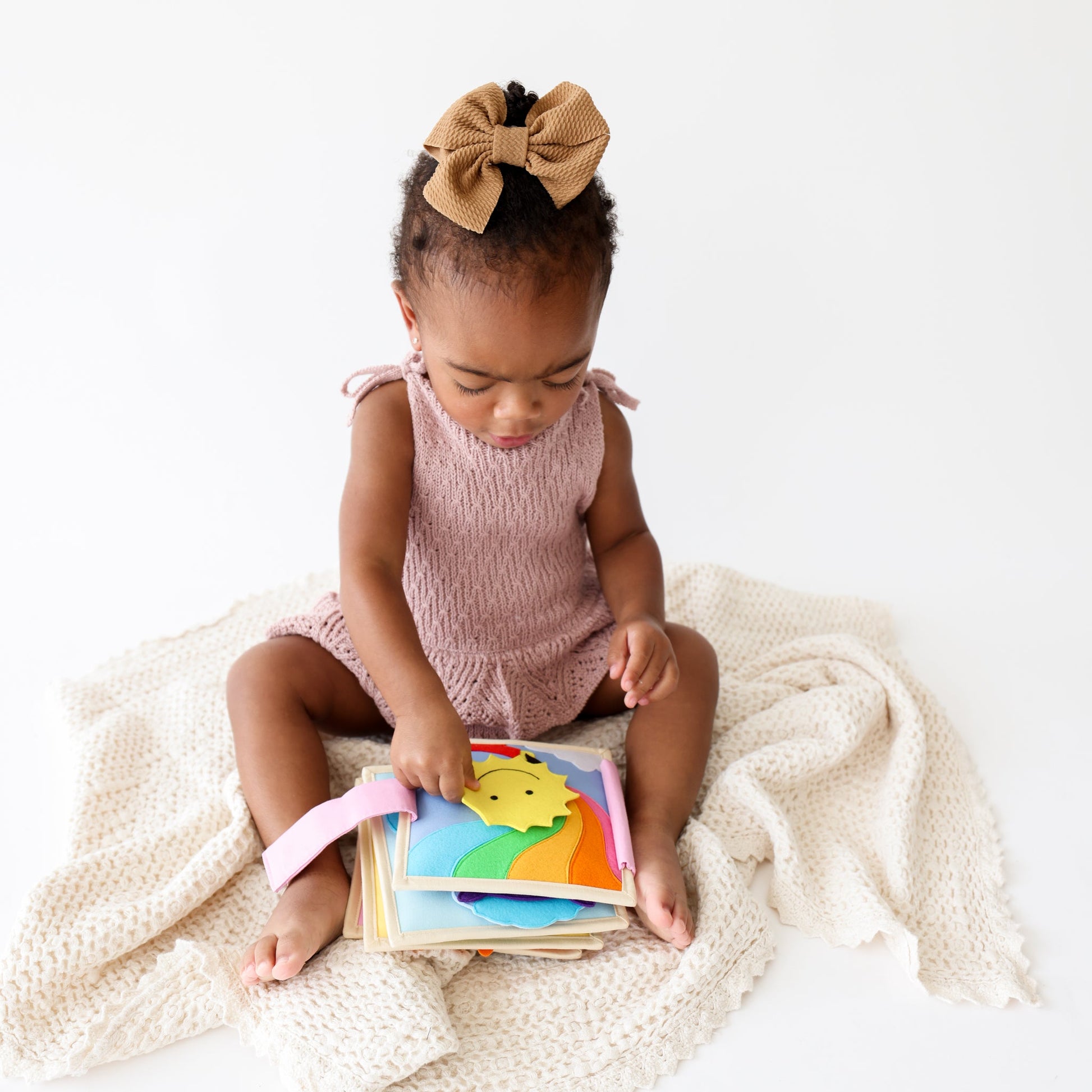 This beautiful rainbow themed quiet book has it all! With sensory play, a rattle, cause and effect activities, extra-large finger puppet, stand-alone mirror, and creative play all crammed into this sweet little diaper bag companion, all we can say is, goodbye fussiness on the go!!